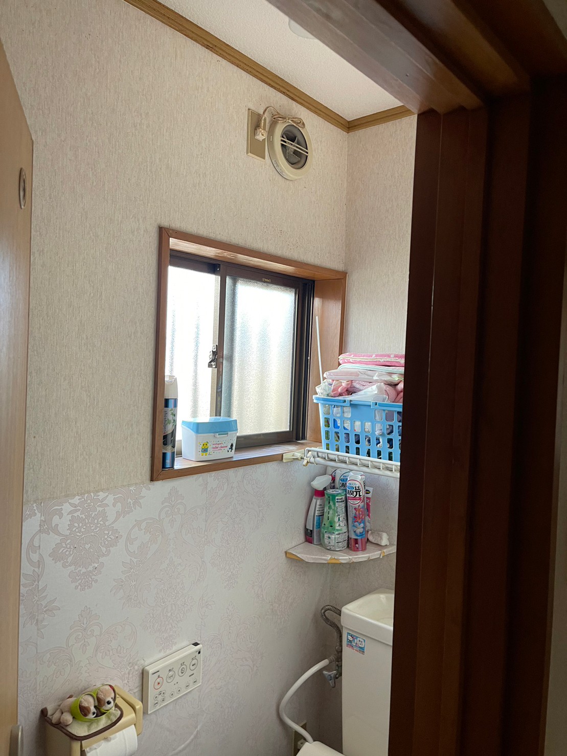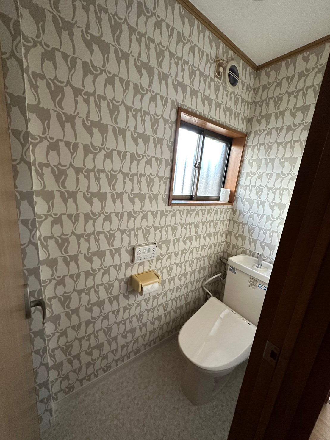 猫の模様のクロスに、同じトーンのグレーベージュのタイルがマッチした、統一感のあるトイレになりました。