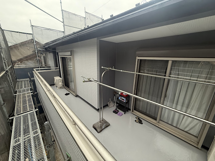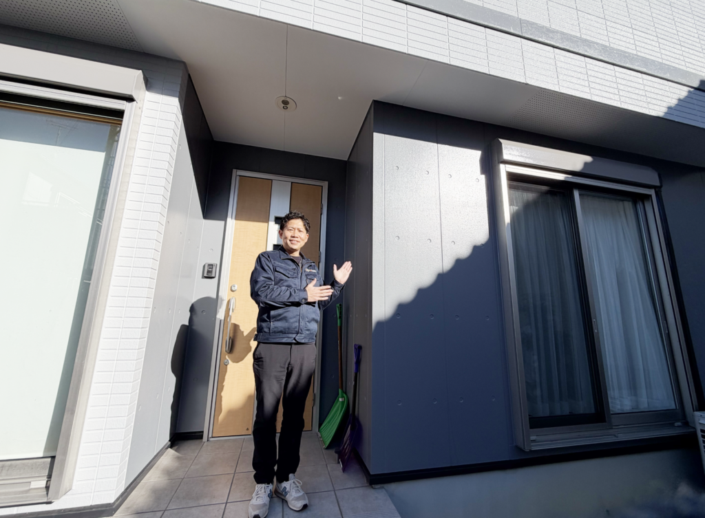 近くのアパートが同じような色に変わったことも背中を押してくれたとのこと。「思い切って変えてよかった」という言葉が、よっちゃんにとって何よりの励みです。2階のベランダ下の施工もピカピカに仕上がり、出入りする箇所は錆びやすいため今後も定期的なメンテナンスをおすすめしています。