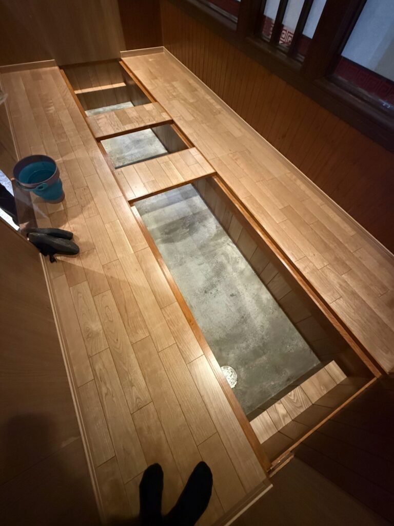 「普通の座敷のテーブルだと、足や腰が悪い方には辛いから、毎回ゆっくり楽に座れるように掘りごたつにしたい」というオーナー様の温かいお気持ちからご依頼いただきました。お客様思いのその言葉に、よっちゃんも全力で応えたいと思いながら施工に臨みました。