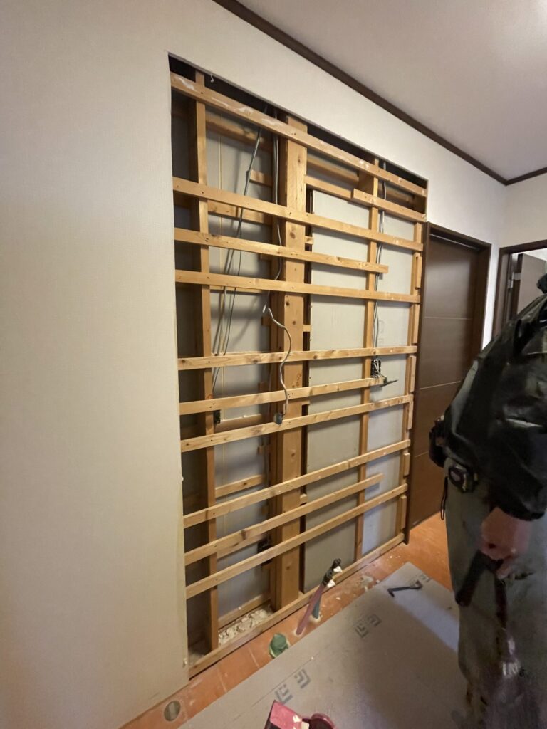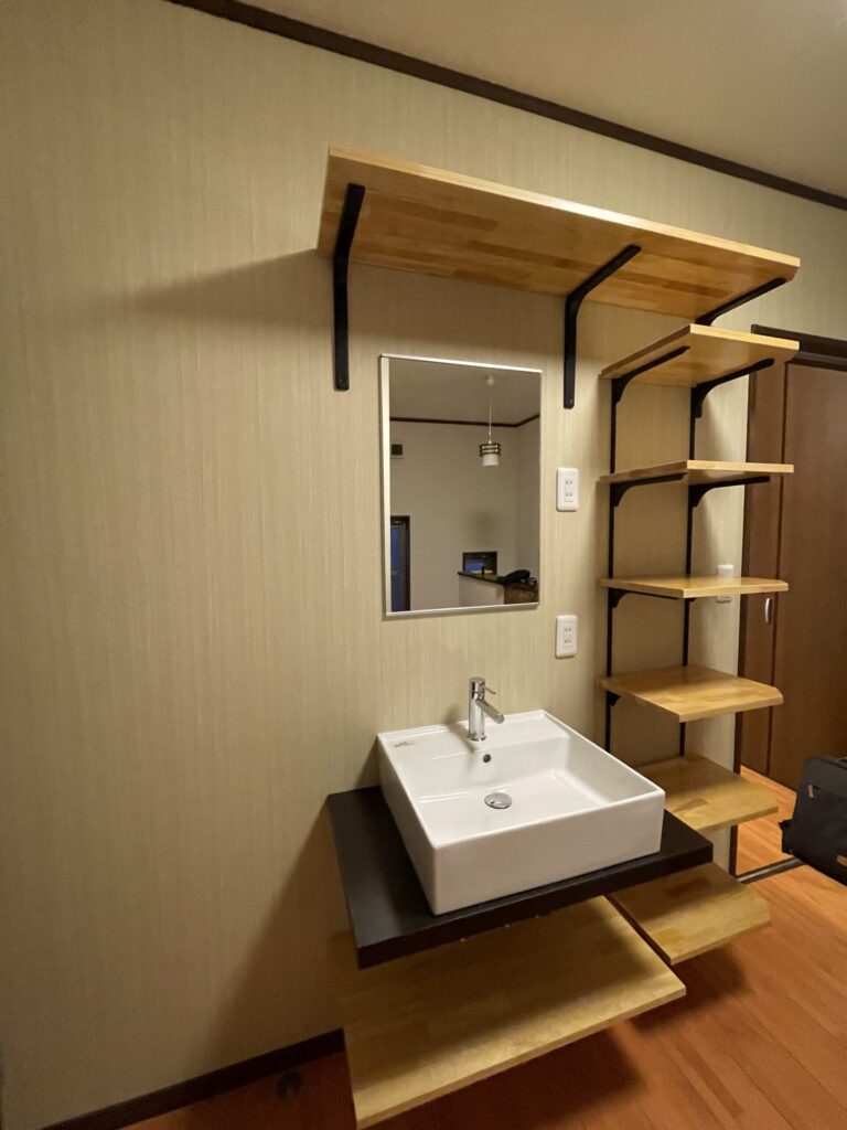 施工場所: 一般住宅(洗面室) 工事内容: 洗面台入れ替え・創作洗面台設置・収納スペース増設 工期: 複数日