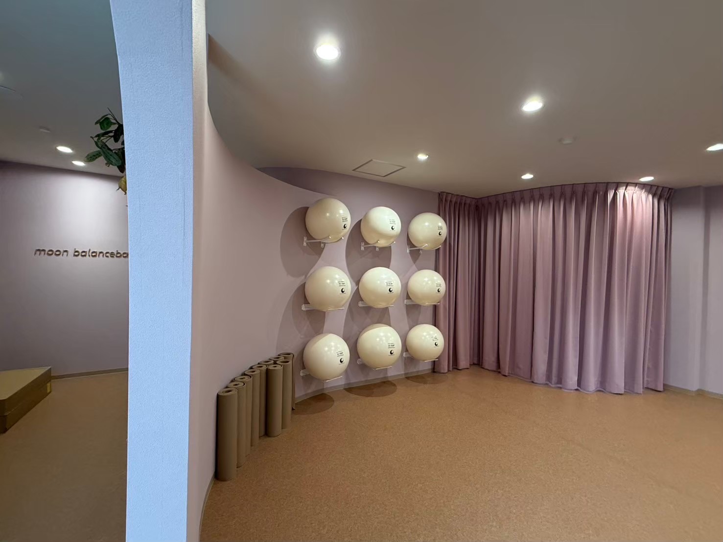 白を基調とした空間は、実際の広さ以上に広く感じられる効果もあり、バランスボールを使った動きの大きなレッスンにも窮屈さを感じさせない仕上がりになっています。