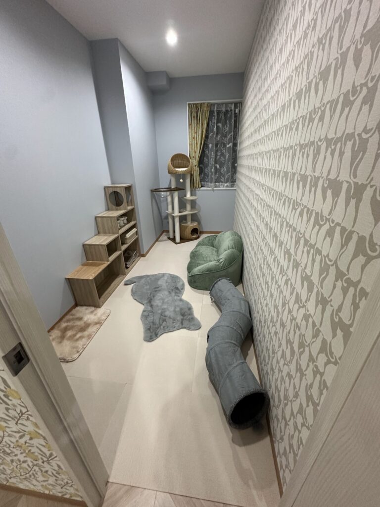 空き部屋を2つの部屋に分けて設計しました。複数の猫を預かる際、同じ空間に見知らぬ猫同士を置くと、互いにストレスを感じてしまいます。部屋を分けることで、